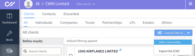 In Clients, All, select the "I would like to..." menu at the top"right of the page and then "Add a new entity". In Clients, Companies, the option is "Add a Company."