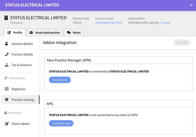 After setting up the add-on for APS or XPM, edit the Company profile. Click Practice Management and select 'Connect now'.
